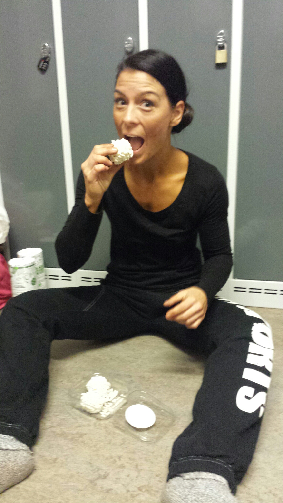 När vi stod och väntade på att få göra chinsen så hände en liten olycka…när tjejen framför mig skulle få flytande magnesium i händerna hade hennes coach glömt ta bort säkerhetspluggen vilket resulterade i att flaskan exploderade…bla över hela mig…i ögonen tex. Chinsen är det jag hade fasat mest för så en smått panikartad känsla uppstod. Coachen var inte där just då, som tur var kom en annan atlet och tillika Trelleborgare, Elna och hennes kille Victor, till min undsättning med en bunke servetter.
