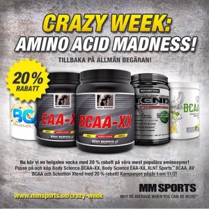 Läs hela inlägget...Missa inte MM sports kampanj ”crazy week” 20 % på aminosyror , whopp whopp www.mmsports.se