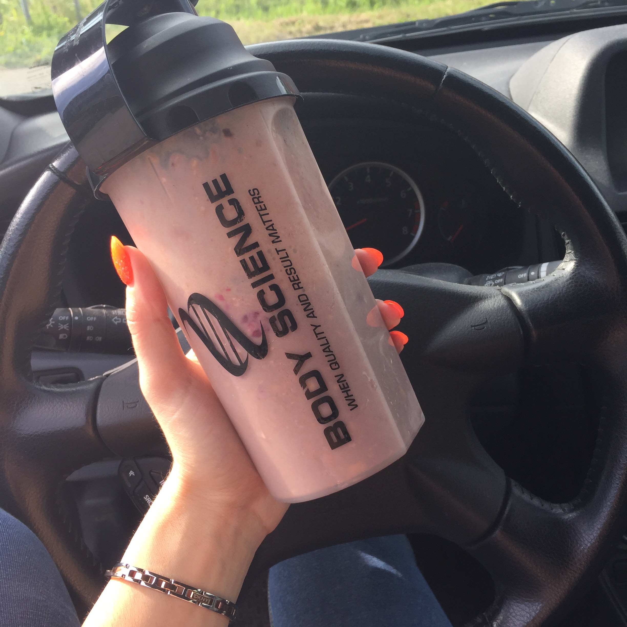 Sitter nu i bilen och avnjuter den godaste shakern innan bilen rullar mot jobbet. 1 dl platinum protein (double chocolate coconut), 1 dl fiberhavregryn, 1-2 dl hallon och cirka 2-3 dl mjölk. Bara att skaka och låta stå en stund! Stört gott!!!