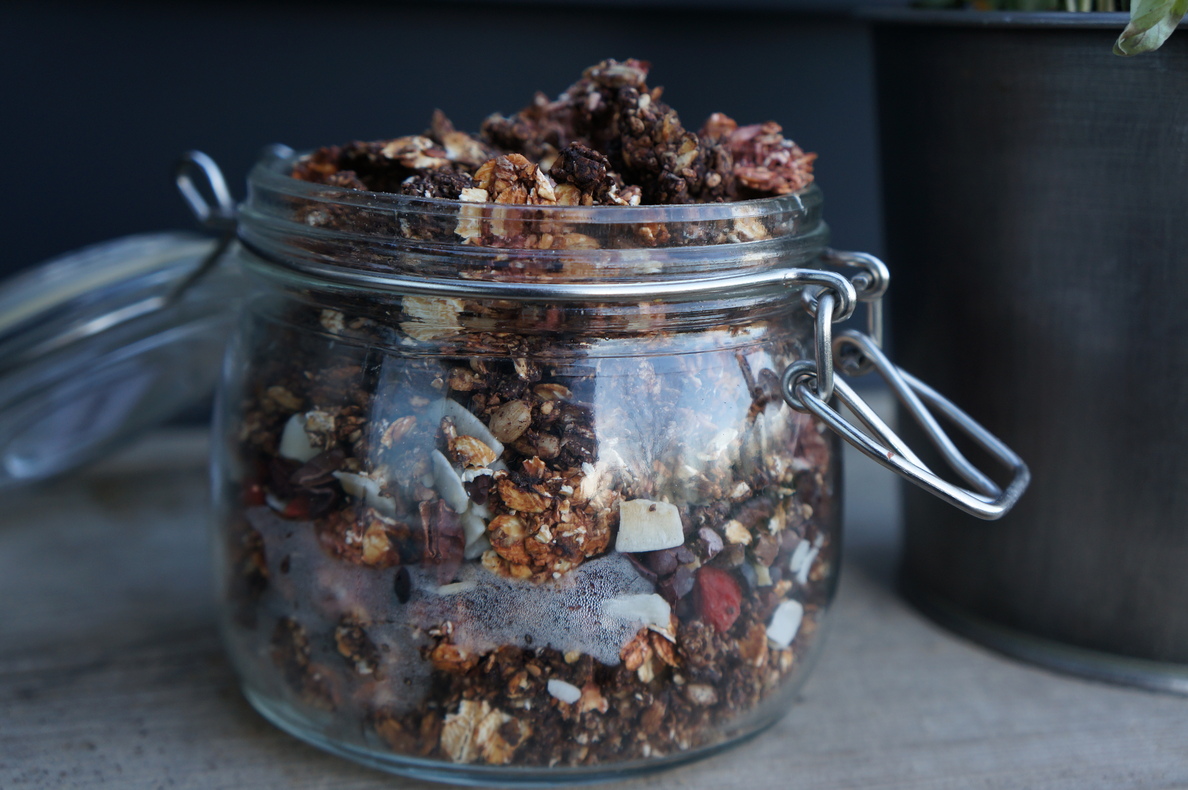 Läs hela inlägget...Ingredienser: 3 dl havregryn, 1 dl chia, 1 dl solrosfrön, 1 dl sesamfrö, 1 dl gojibär, 1 msk kokosolja, agavesirap, 1/2 msk rå kakao, 1 tsk kanel, 1 tsk ingefära. Strö ut alla ingredienserna – utom olja och agave – på en plåt och ringla sedan över smält kokosolja och agave. Ta en slev och rör […]