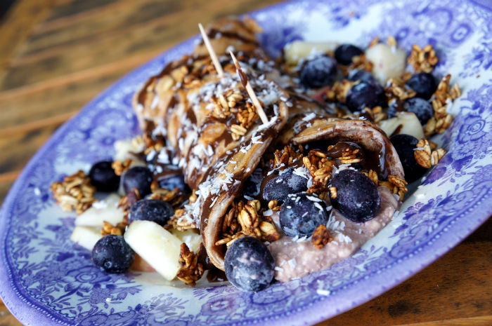 Är det något som känns lyxigt gott så är det att äta pannkaka till frukost. Speciellt nu under lediga mellandagar där man har tid att göra både en god pannkaka och ha en extra god fyllning till det. Dessutom går det ju att göra pannkaka på så himla många olika sätt, helt utan gluten. Denna pannkakan blir lite tjockare och är underbart god att fylla med gottigheter och göra en pannkaksrulle av.