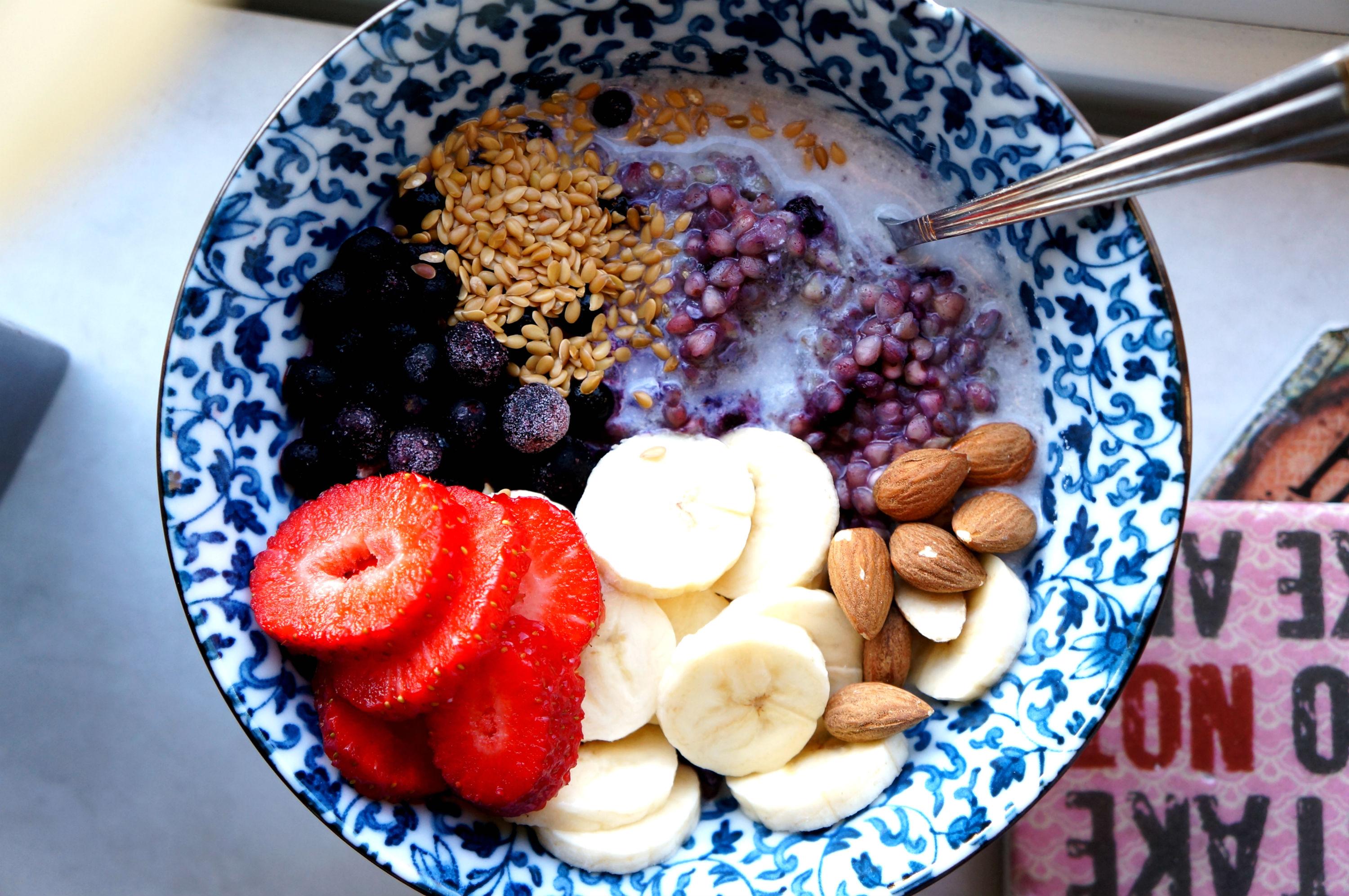 Blötlägg 1 dl helt bovete på kvällen. Skölj sedan av det noga på morgonen och koka upp tillsammans med 1 1/2 dl vatten eller mjölk och en 1 dl frusna blåbär & en halv matsked jordnötssmör.Servera med hemgjord nötmjölk, linfrö, färsk frukt och bär plus en näve nötter. En perfekt stärkande och näringrik frukost!
