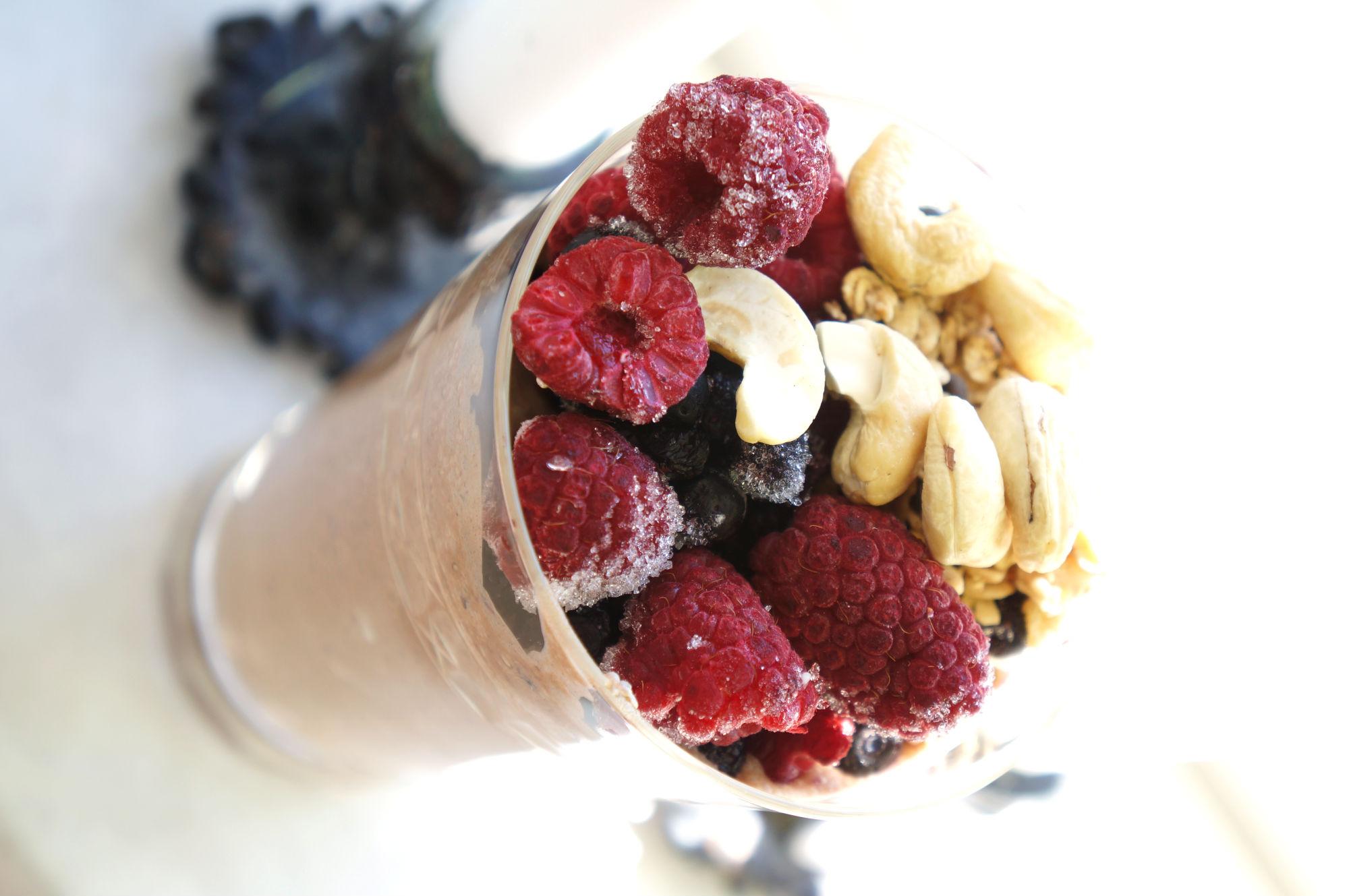 Denna är gjord på 2 dl mandelmjölk, 3 matskedar chiafrön, 1/ liten banan, 1 msk rå kakao, lite dadelpuré (eller valfri sötning) & fylld med frusna bär och nötter. Bara att röra samman ingredienserna till puddingen, ställa i kylen ch låta det svälla medan du rör om då och då för att få det jämnt.