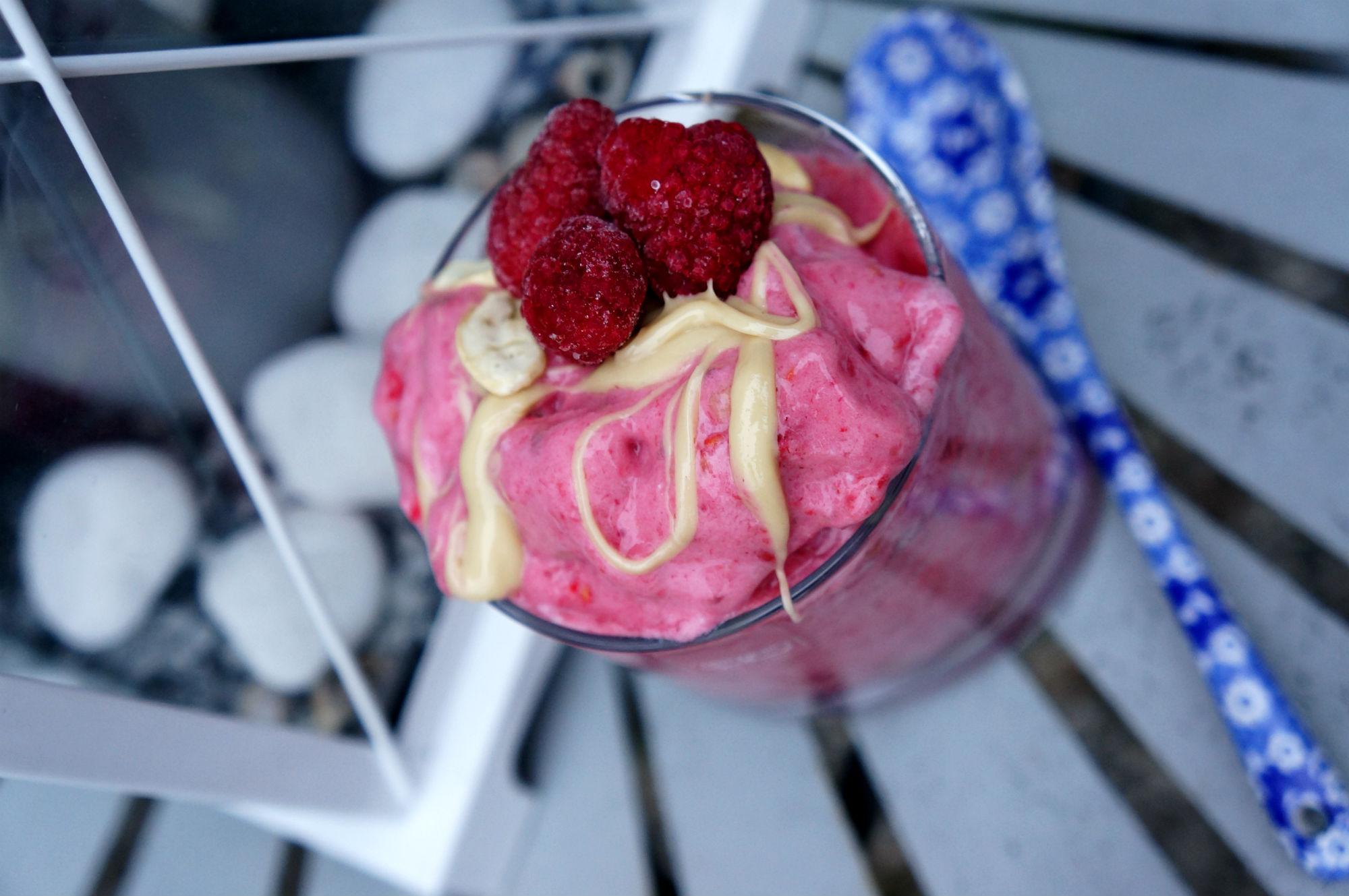 Frys en banan i slantar (eller gör som jag och ha bananslantar i frysen konstant) och mixa tillsammans med en deciliter frusna hallon, en matsked jordnötssmör och lite mandelmjölk eller vatten tills det blir en mjuk glassig konsistens. Ringla lite nötsmör på toppen för extra smarrighet.