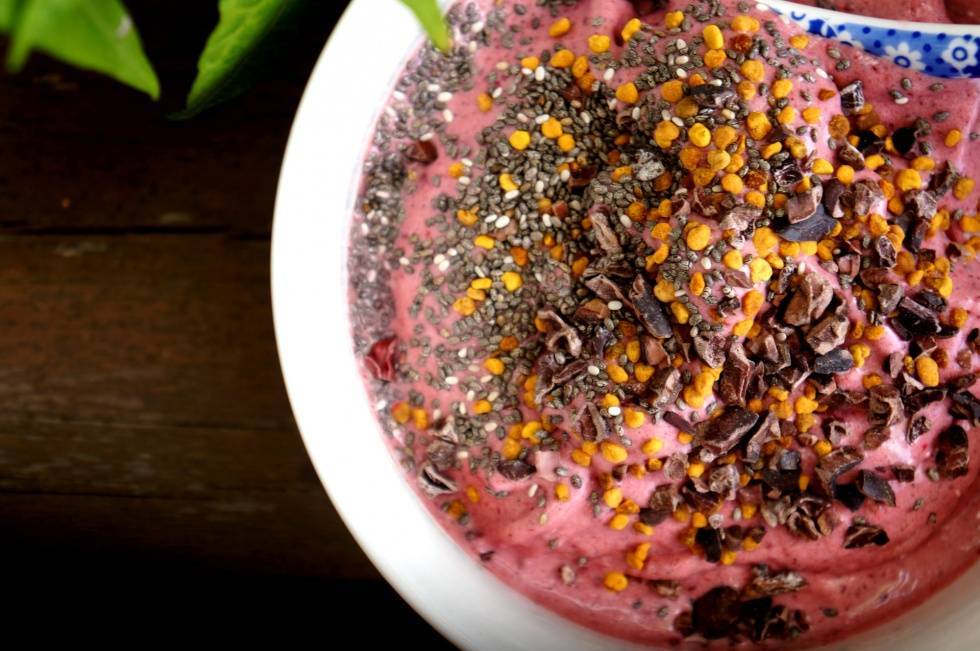 Mixa samman 2 dl frusna jodgubbar med 1 dl frusen banan, 1 msk acaipulver & 1 /2 dl kokosmjölk. Toppa med extra hälsoboost som chiafrön, kakaonibs & bipollen och du har allt du behöver för en bra start på dagen.