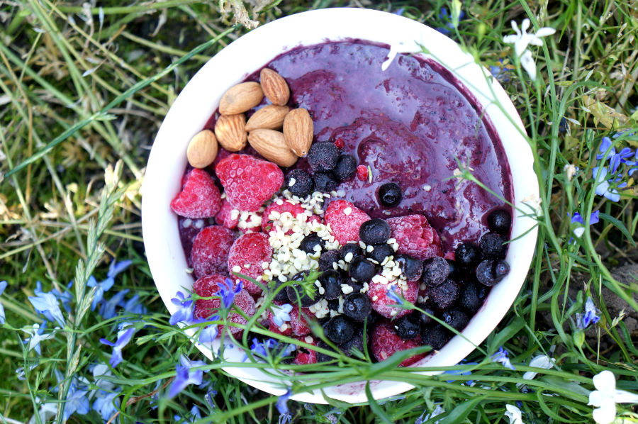 Till postworkout mål en glassig blåbärsröra (blåbärsbesatt?) på 2 dl mandelmjölk, 1 dl frusna gröna ärtor, 1 dl frusna blåbär, 1 msk mct-olja, 2 msk (valfritt) protein & eventuellt någon form av sötning. Och allt blir lite roligare med topping i form av frusna bär, nötter och frön.