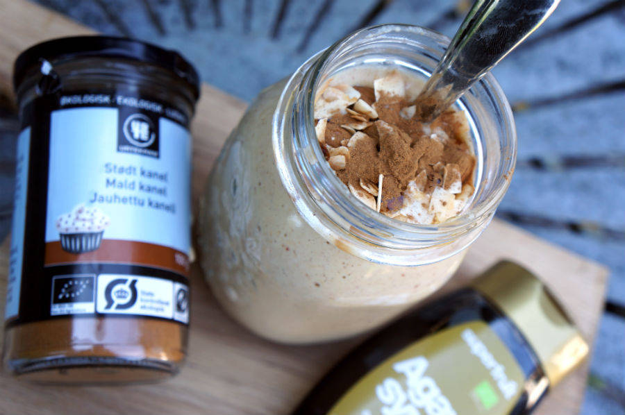 Ingredienser (1 person): 3 (eko)äpple, 1/2 dl kokosmjölk, 1 dl kokosvatten, 1 msk agavesirap, 2 msk jordnötssmör och kanel. Mixa – slurpa i dig!
