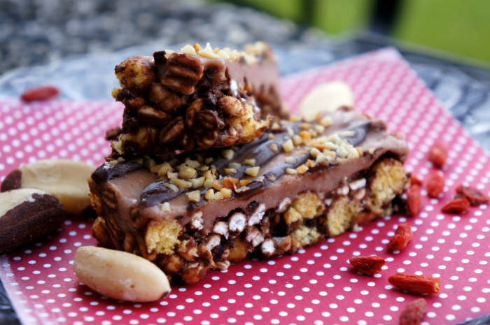 Blanda samman alla ingredienser till lager ett. Blanda först alla torra och rör sedan samma med de våta – smält kokossmör innan du rör ner det. Jag vet att alla inte har pandapuffar – men använda vilka puffar som helst, granola eller annan söt bas. Ta sedan en brödform och klä med plastfolie. Ner med en jämn gegga i botten och in i frysen ett tag.