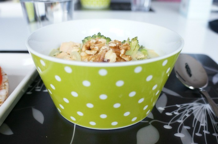 Fräs upp lite kokosolja i en kastrull tillsammans med ingefära, curry, lemongrass och två hackade vitlöksklyftor (vet ej hur mycket men mycket curry och mindre av de andra) stek ner en normalstor lök och fräs en stund. Tillsätt sedan 1 burk kokosmjölk, 1/2 paket edamamebönor, små bitar färsk broccoli samt 3 laxfiléer. Salta och smaka av efter att det kokat upp tillsammans. Krydda eventuellt mer och smaksätt med någon tesked lime. Häll upp i skål och toppa med valnötter. Vi serverade med riskakor och ris bredvid – men det är ju helt upp till smaker
