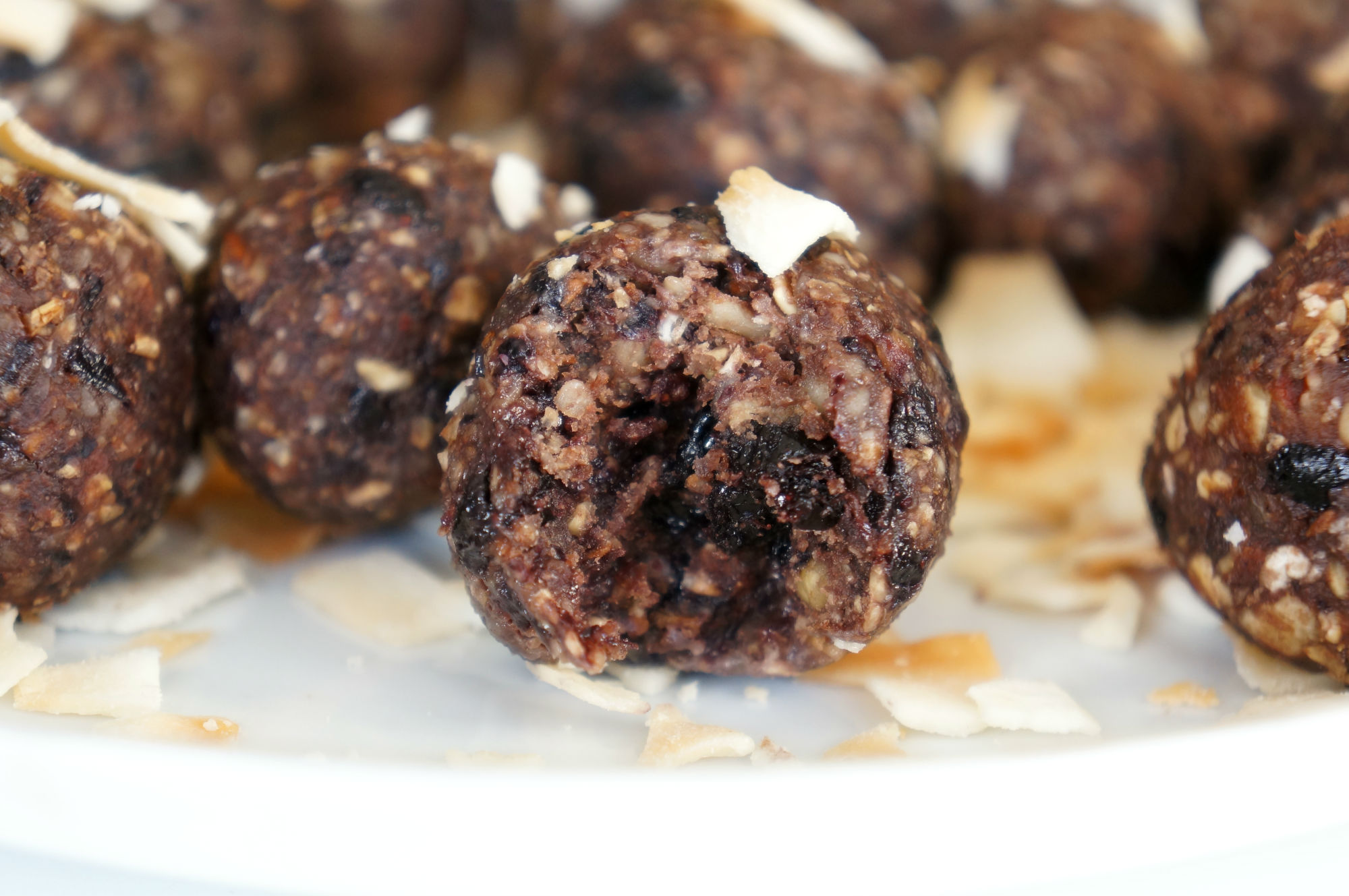 Ingredienser (ca 15 st): 1 dl cashewnötter, 1 dl pekannötter, 2 dl torkade blåbär*, 3 tsk havreprotein, 2 tsk kakao, 1 nypa vaniljpulver, 1 dl vatten & 1 dl havregryn.