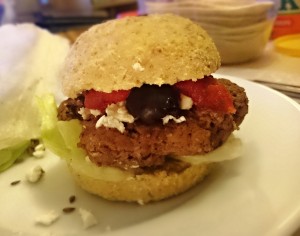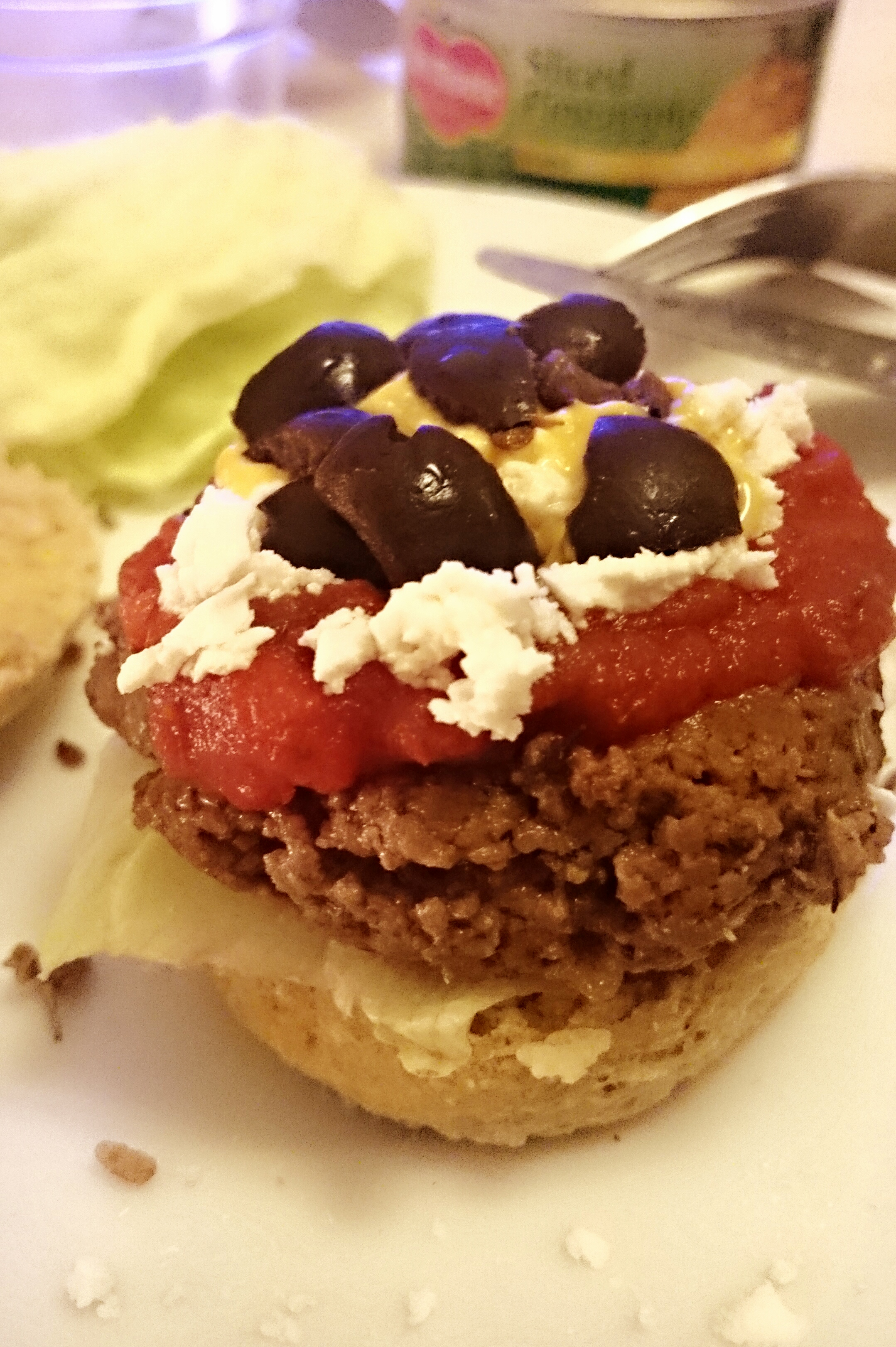 Du får själv välja hur du vill toppa burgarna. Jag gjorde här topping av 25 gram fetaost (3%), lite oliver, krossade tomater och ett salladsblad i botten. Nam Nam!