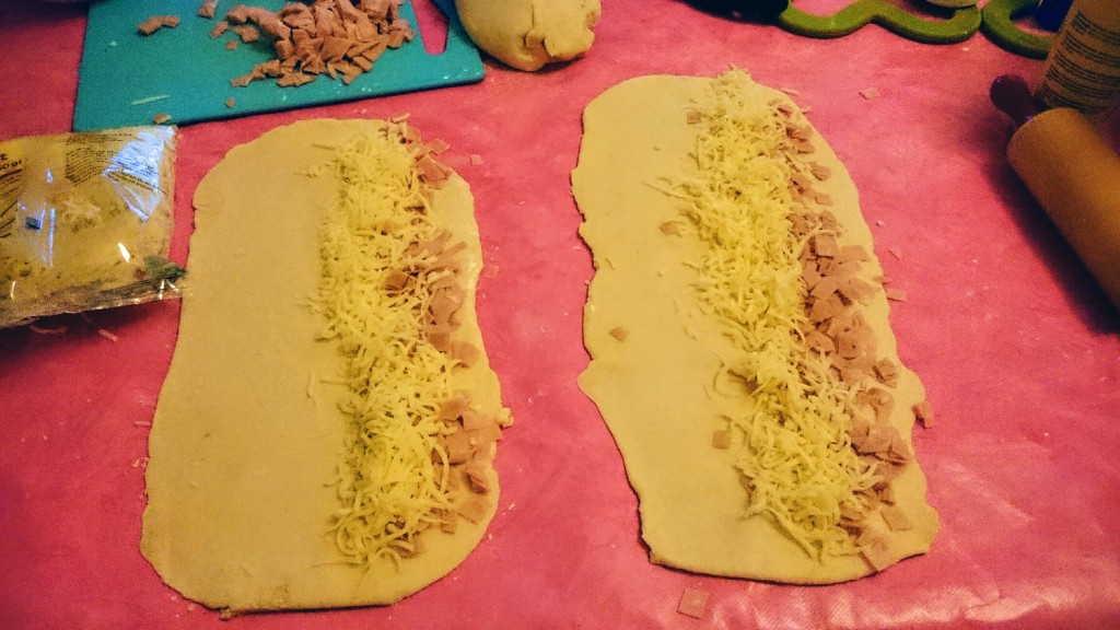- Häll ut degen på bakbordet. Dela upp den i fyra delar, kavla ut den till ca 40 x 20 cm stora kvadrater. Fyll ca hälften med ost och skinka. Rulla tight ihop degen till stora rullar och dela den till mindre bullar.