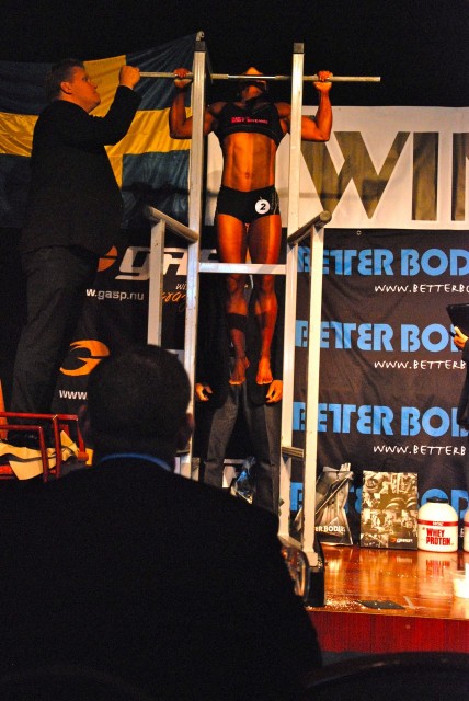 Jenny gav Helena en riktig match även i chinsen. ( Här ser man också domarnas positioner för att se till att allt går regelrätt till. Över med hakan och en bakom för att se till bredden på greppet samt benen.)