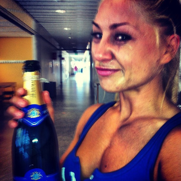 Ser ut som ett halloweenskämt, men det gör inget för det är ett foto i precisa stunden som beskriver väldigt mycket av alla de känslor som svallade över mig där och då samtidigt som jag korkade upp en Champagne jag fick i början av 2010 när jag startade min utbildning och fitnesskarriär! SOms agt mycket känsla och symbolik 🙂