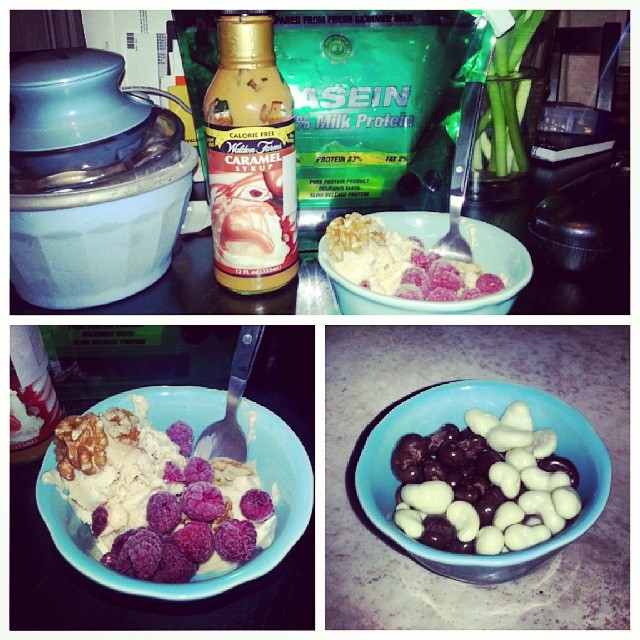 Du behöver: Glassmaskin, mjölk, ägg, kesella, vaniljpulver (ekologiskt äkta) Bodyscience Casein Vanilla Ice Cream, Walden Farms Caramel, Valnötter och frysta hallon som garnityr.