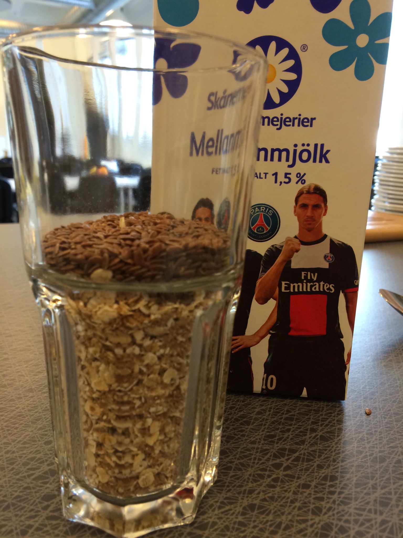 60 min innan: 1.5 dl Havregryn, 1 msk linfrö och mjölk.