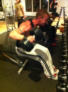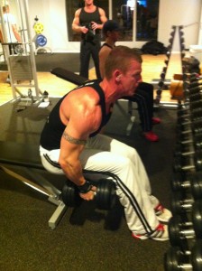 Passet bestod i axelpress i smithmaskin 85kg * 6 set, hantel bänk 90 grader 24 kg * 4 set för baksidan, hantel ut 20 kg * 4 set och drag till hakan 45 kg * 2 set i smith. Kan erkänna att jag var rätt trött i axlarna redan när passet började, anledningen är/var nog rätt enkel morgonpasset och massagen hade satt sina spår……sen ska vi inte glömma bort att jag är i slutet av veckan under diet med mycket träning under veckan 🙂 men you can´t cheat to defeat…everyone else….
