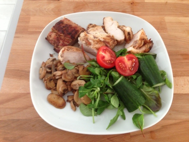 Måltiderna sammanlagt: 680g kyckling, 250g fläskfilé, 1 st avokado, blandsallad och champinjoner. Utan salladen inräknad blir detta 2050 kcal, 382g protein, 14g kolhydrater och 52g fett.