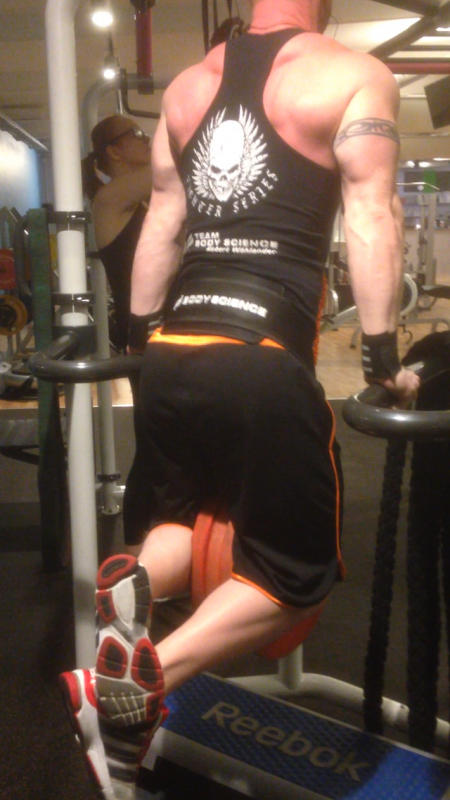 För axlarna blev det skivstång bakom 5 set där jag idag startade med 105kg…kändes sjukt bra, 5 set kryssdrag utåt och avslutade med 5 set lutande kryssdrag för baksidan. Sen var det bara att avsluta med en hög set dips….grymt tryck i kroppen efteråt kan jag säga ;).