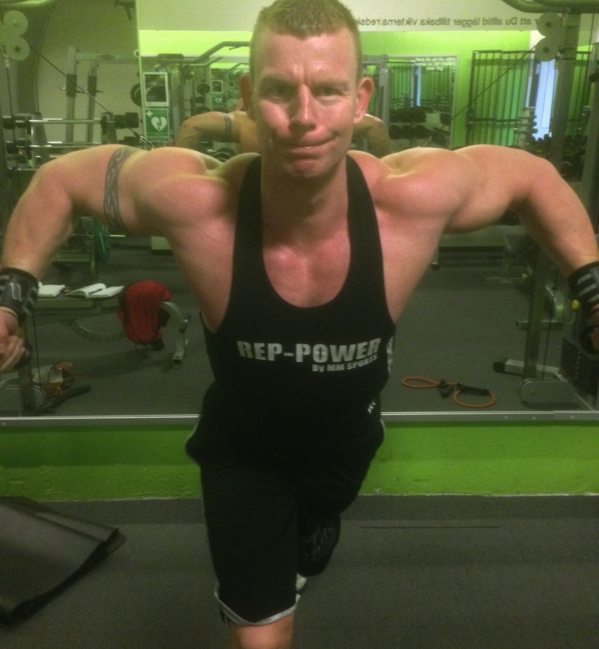 Körde bara 1,5 övning på varje muskelgrupp biceps&triceps, hantel stående/dubbel km för biceps och push-down bänk/en km för triceps då jag åkte på en dundrande huvudvärk mitt i passet….ha ha kanske inte så konstigt när man hade ont i hela kroppen av träningen efter lång vila….nåja det var bara att ta det som det var och göra det bästa av det.
