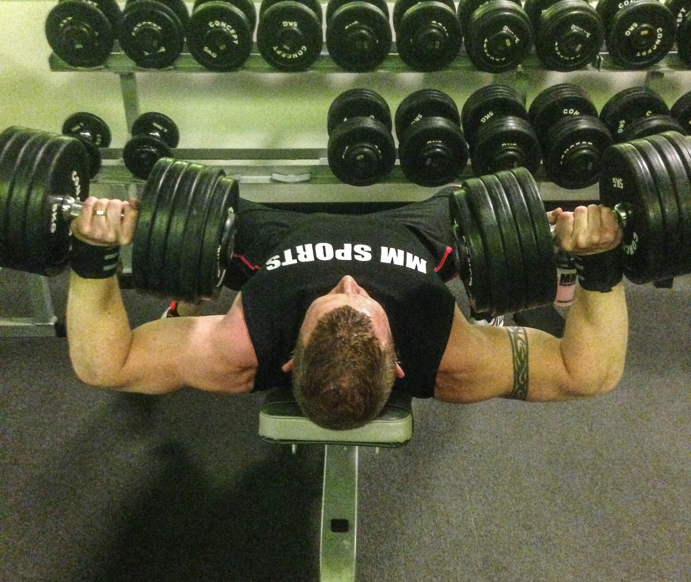 Snedbänk hantel 7 set…..min absoluta favvisövning när det kommer till bröst, bra tryck och kontakt. Och om 50kg’s vikterna var tunga förra veckan så var det lätta denna :-), me so like.