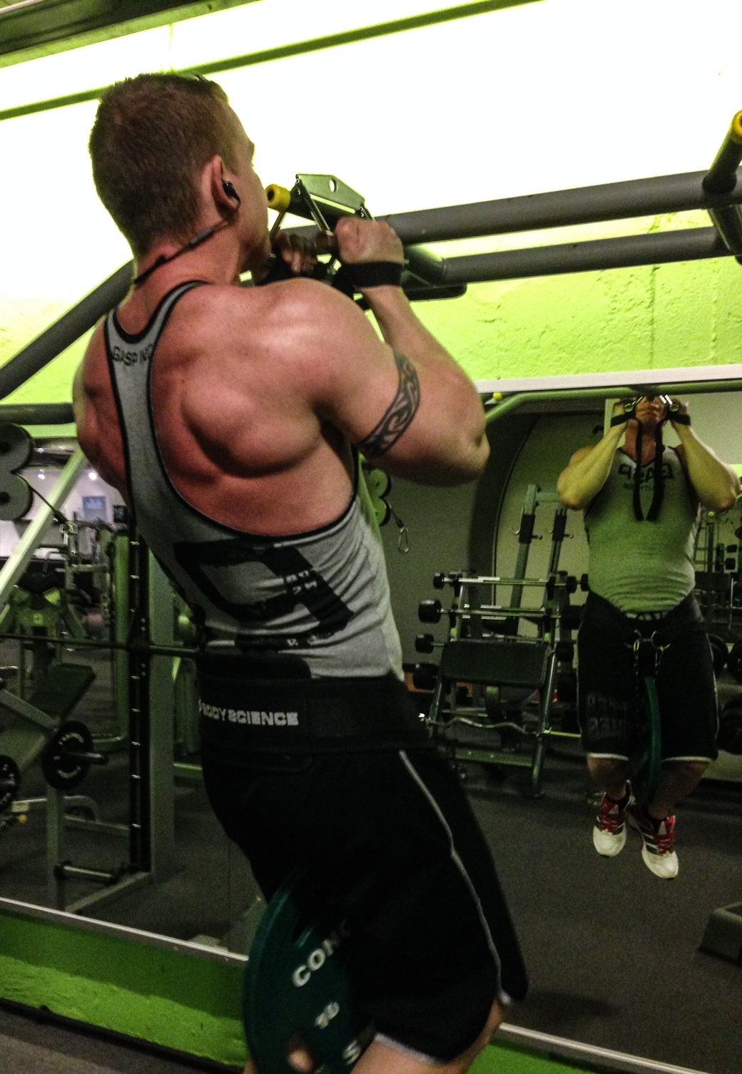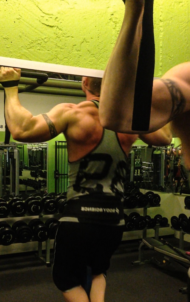 Naturligtvis startar vi även detta schemat med chins, 7 set…finns det något annat :-)? Trots tidig morgon och 5 passet i rad blev det faktiskt en 11 repsare på första. Varierade sedan varannan med remmar och varannan utan remmar för att öka upp greppstyrkan……