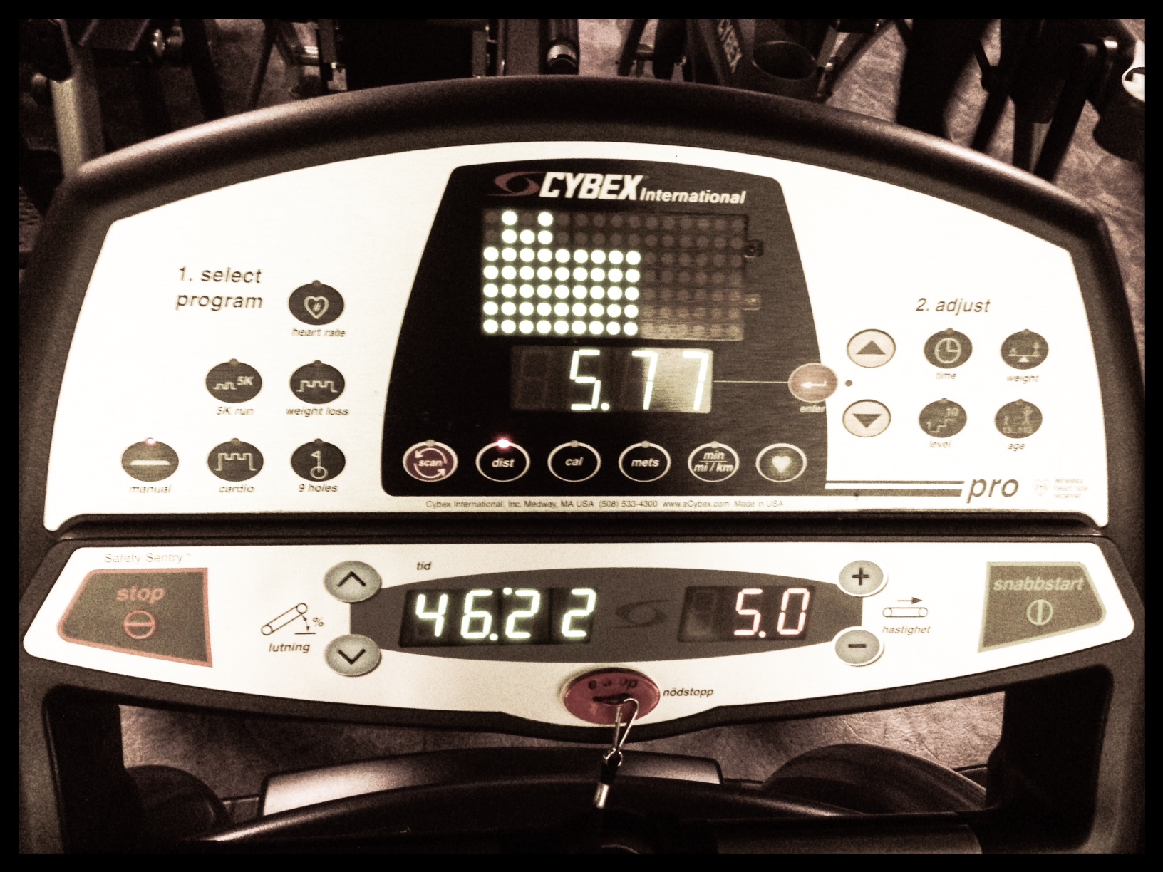Först väckte vi kroppen lite på bandet därefter blev det 1,5 minuts intervaller i 6% lutning…..med 1,5 minuter vila/promenad emellan.