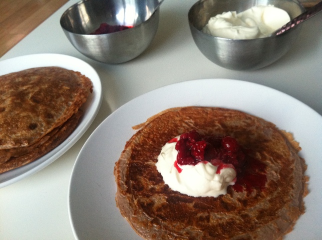 Jag stekte på 7:an (av 12) då de tar ett tag att steka igenom. Servera med valfritt tillbehör, jag valde mildas vispgrädde 20% och hallon.