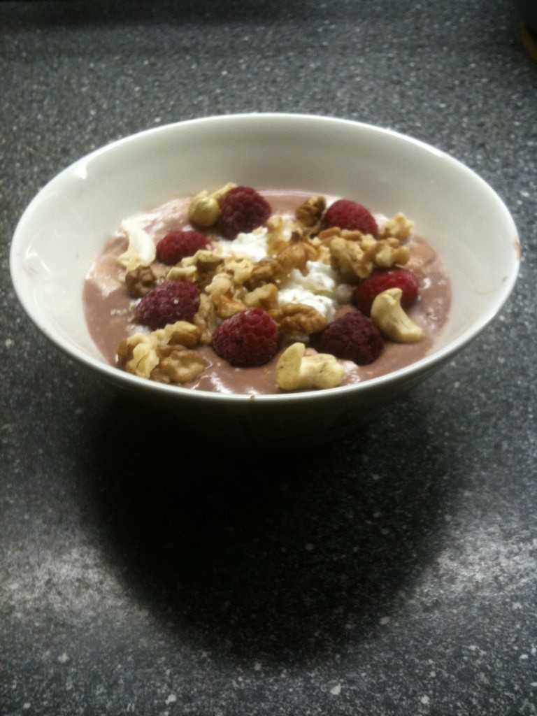 Fika De´lyx…blanda ca 30 g av MMsports Casein choklad/mandel till en pudding, lägg till en matsked keso, krossa över några valnötter och lite hallon…..perfekt avrundning på en perfekt dag,,,