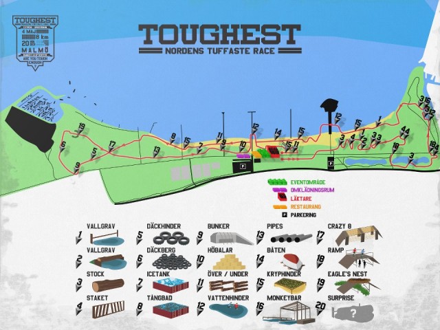 8 km lång och med 20 st olika hinder på vägen, dessutom genom vatten, isbad och sandstrand.