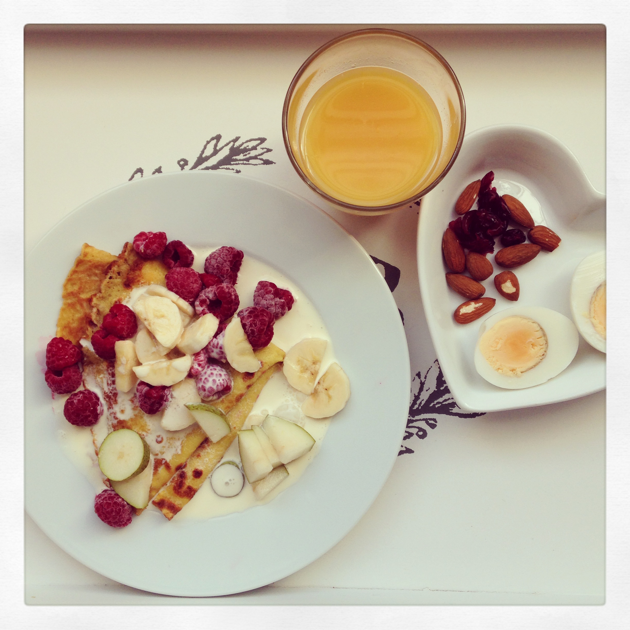Pannkakor på ägg från syrrans lanthöns, hallon, banan och päron. Nötter, tranbär, ägg och färskpressad apelsinjuice.. Lägg lite tid på frukosten blir så mycket roligare och godare 🙂