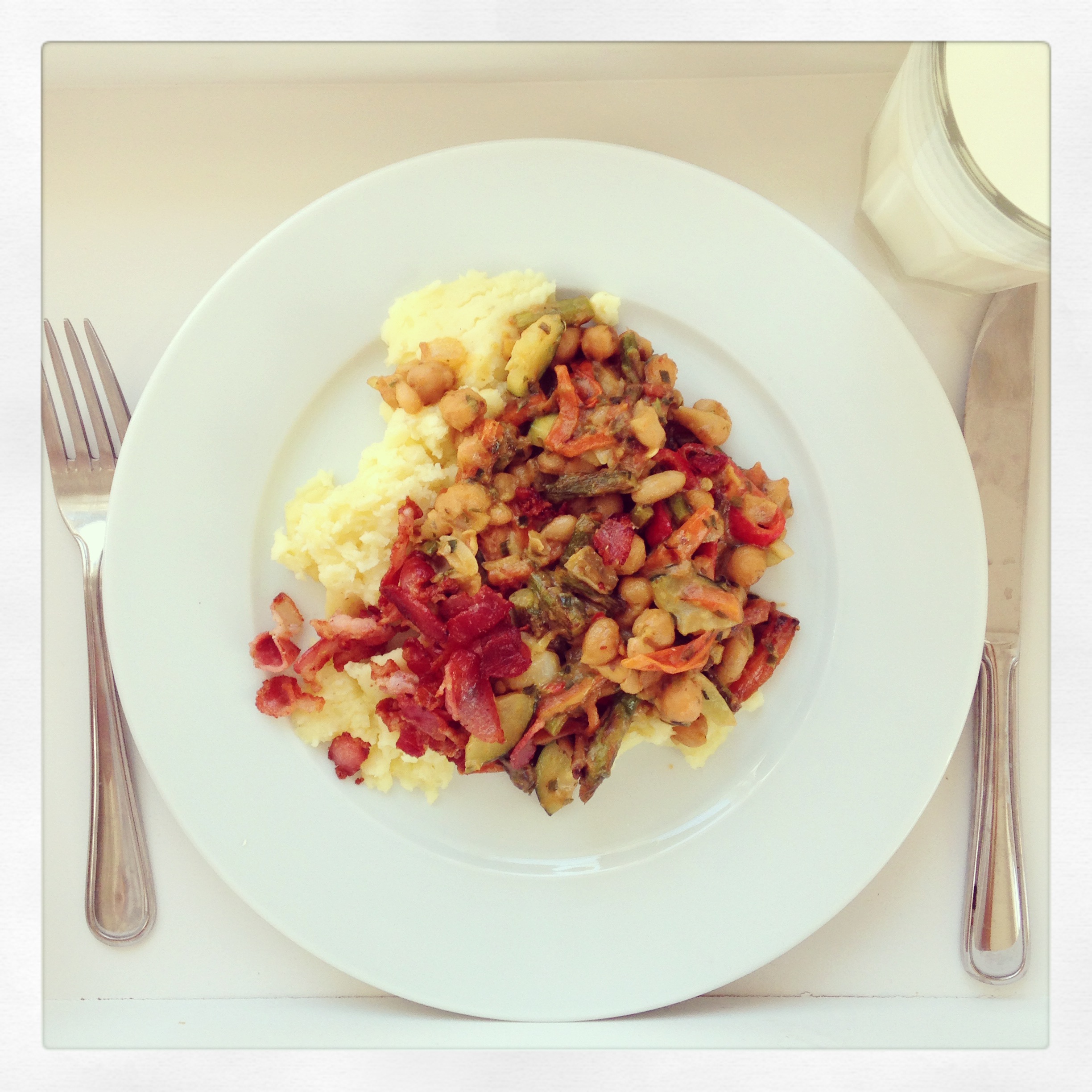 Gårdagens potatismos, vegetarisk gryta av, Blandade ekologiska bönor, strimlade morötter, färsk sparris, gul lök, paprika, tomater, basilika, persilja, grönsaksbuljong, lite chili och 2 msk grädde… lite knaperstekt bacon på toppen av det.. Yammiiee